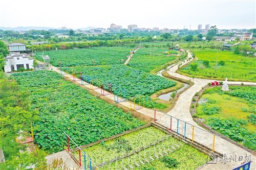盛夏的坭陂镇文东村如同一幅诗意的田园画卷:潺潺流水,荷花依依,荷叶田田,青青禾秆随风摇曳,“丰景”可期。