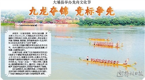 本报讯 (记者洪国栋 特约记者余灏 罗文燕)6月22日上午,大埔县龙舟文化节在三河镇韩江河畔举办(如图,连志城摄),来自该县三河镇、湖寮镇、高陂镇、茶阳镇等地的9支龙舟队伍200余名选手参与了龙舟“竞渡”。
