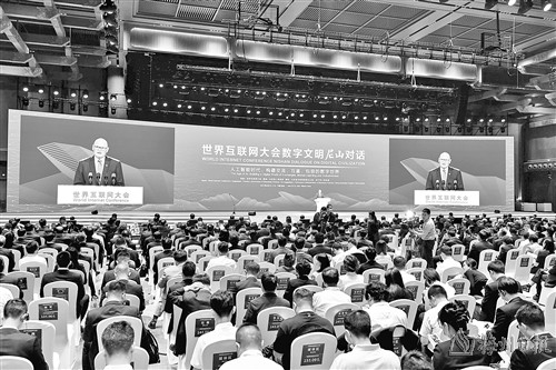 6月26日,在世界互联网大会数字文明尼山对话上,全球移动通信系统协会首席执行官洪曜庄做主旨发言。