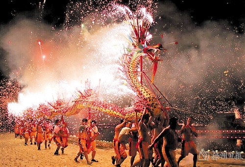 “火龙”在鳌、鲤、虾、绣球等的引领下出场,绕场三周后由德高望重的长者(或捐资助学最多者)点燃“火龙”,随后由几十名赤膊大汉手擎火龙,在绣球的引领下舞动游走。被点燃的“火龙”立即从嘴里吐出火珠,随即铳炮、鞭炮、鼓乐齐鸣,龙身便随之喷出缤纷焰火,漫天光彩,构成声光强烈、情境壮观、群情欢腾的盛大场面。