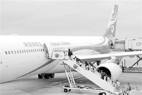 图为在爱尔兰首都都柏林机场,乘客登上一架即将飞往北京的中国海南航空公司客机。(新华社发)