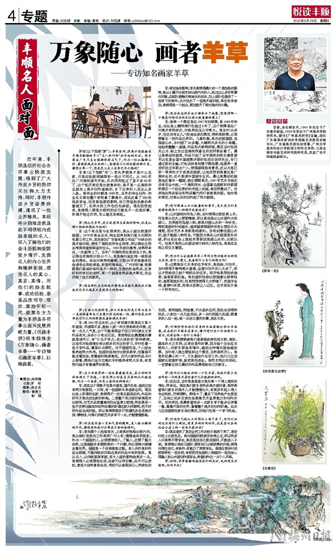 近年来,丰顺县经济社会各项事业快速发展,得到了广大外出乡贤的热切关注和大力支持,同时,丰顺外出乡贤奋勇拼搏,涌现了一批业界精英。本报将分期推出我县在不同领域内成就卓越的名人,深入了解他们的奋斗历程和爱国爱乡情怀,发掘名人的内心世界和精神面貌,感受名人的真心、真言、真情。用他们的励志故事、成功经验、崇高品质引导、带动、激励年轻一代,凝聚各方力量为丰顺县各项事业振兴发展贡献力量。《悦读丰顺》报本期推出《万象随心,画者羊草——专访知名画家羊草》,以飨读者。