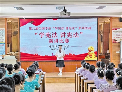 “当我们呱呱坠地,来到人间,便成为一名幸福的中华人民共和国公民。在儿时,我们能享受到《未成年人保护法》的保护;上学了,我们又能享受《义务教育法》的保护……”25日下午,在梅州市艺术学校阶梯教室内,一场“学宪法 讲宪法”演讲比赛正在如火如荼进行,选手们依次登台,围绕宪法主题,结合时事热点和自身学习生活经历,阐述对宪法的理解和认知,抒发对宪法的尊崇之情,讲述自己与宪法的故事。