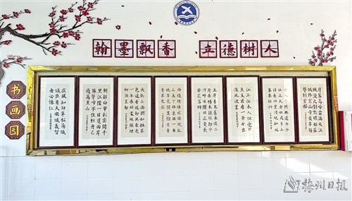 近年来,该校不断为校园文化注入书法文化内涵,让每一个学生每时每刻都受到书法文化的熏陶。走廊上、楼梯边、教室外墙、作品展示墙……校园内随处可见书法的元素,学生的书法作品、书法名家作品、书法名家故事、翰墨文化装饰了整个校园,育人氛围浓郁。同时,该校还专门打造了书法专用教室、书画园、书法作品展示栏等,为师生提供了一个学习书法、练习书法、欣赏书法的场所。