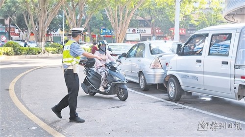 此外,记者在现场看到个别驾驶汽车和摩托车的司机为了贪图方便,在新中路往梅江四路方向的辅道逆行,执勤民警及时拦停,对驾驶员进行严肃的批评教育,并依法依规对其进行处罚。