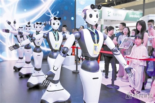 7月6日,在达闼展位,人形机器人进行“千手观音”表演。