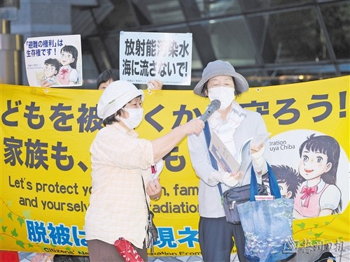 近百名日本民众5日晚在福岛第一核电站运营方东京电力公司总部前举行集会,抗议福岛核污染水排海计划。