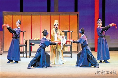 7月2日,原创大运河题材黄梅戏《第一山》在江苏大剧院上演。据介绍,《第一山》由江苏省盱眙县黄梅剧团创排演出,全剧以苏轼游览隋唐大运河地标之一“第一山”、挥毫而就《行香子》为切入点,展现大运河丰富的历史文化。图为演员在黄梅戏《第一山》中表演(7月2日摄)。 (新华社发)