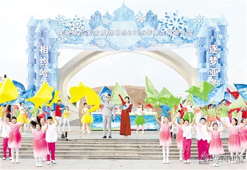 7月8日,在哈尔滨市太阳岛景区太阳石广场,人们庆祝哈尔滨市获得2025年第九届亚洲冬季运动会举办权。