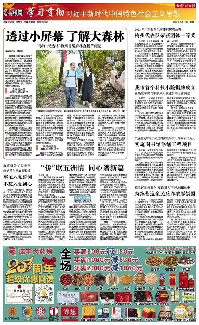 直播间热闹起来的同时,森林直播节活动现场也是精彩纷呈。“让我们一起为保护森林资源,为建设绿美生态梅州而奋斗……”7月8日上午9时30分,梅州首届森林直播节开幕式上,绿美梅州宣传小使者、梅州日报小记者稚嫩的童声,为梅州日报读者团森林徒步游、绿美梅州宣传小使者探访天然林、林下经济产品展示等系列活动拉开序幕。