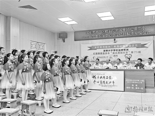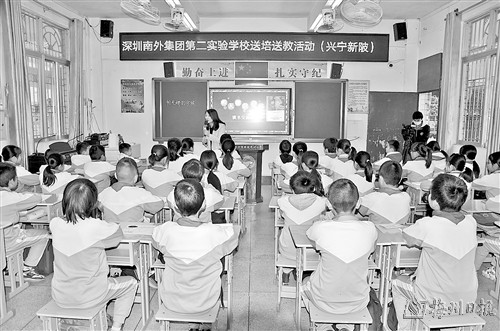 今年2月,深圳市南山外国语学校(集团)第二实验学校启动了对兴宁市新陂中心小学、新陂中学的帮扶工作。目前,双方已形成合作机制,从学校管理、师资培训进行全面帮扶,已开展了多场送教送培活动。“虽然结对帮扶至今仅一学期,但成效明显。”新陂镇中心小学校长潘君宏坦言,该校教师队伍普遍年龄较大,通过结对帮扶,教师们了解了先进的教学理念、教学方式,进一步拓宽了眼界,在教改、教学理念上提升明显。此外,针对山区儿童普遍存在阅读量不足的问题,深圳市南山外国语学校(集团)第二实验学校在新陂中心小学推广“推阅行动”,引导师生丰富阅读量,积累知识储备。目前“推阅行动”广受好评,成效渐显。
