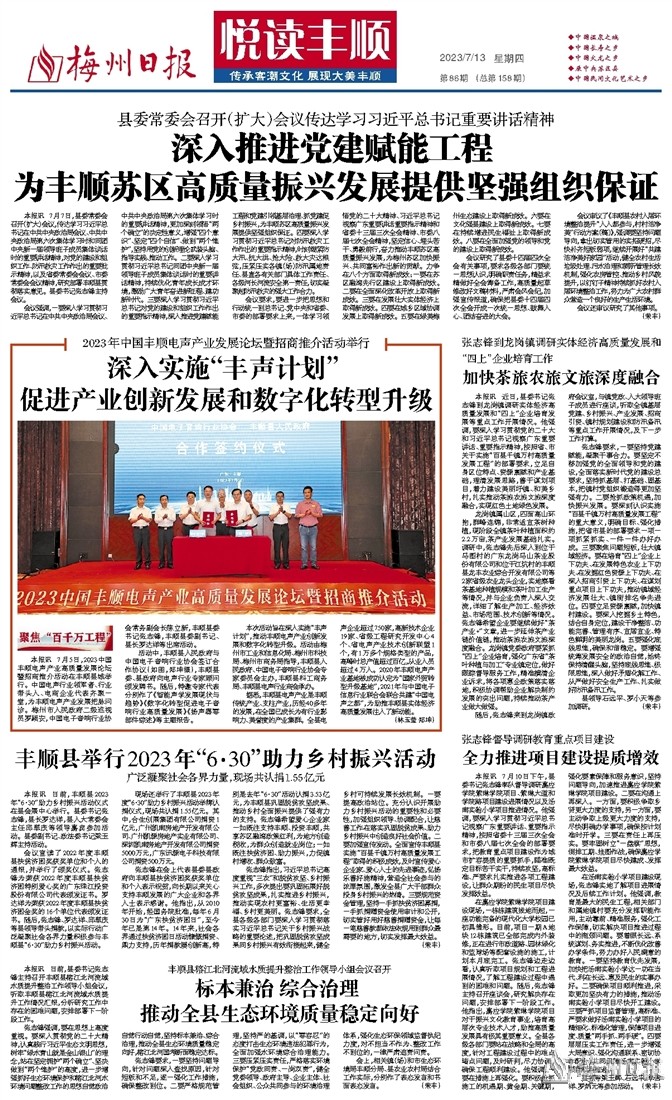 本报讯 7月5日,2023中国丰顺电声产业高质量发展论坛暨招商推介活动在丰顺县城举行。中国电声行业领军者、行业带头人、电商企业代表齐聚一堂,为丰顺电声产业发展把脉问诊。梅州市人民政府二级巡视员罗颖安,中国电子音响行业协会常务副会长陈立新,丰顺县委书记张志锋,丰顺县委副书记、县长罗达祥等出席活动。