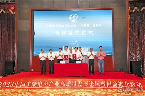 活动中,丰顺县人民政府与中国电子音响行业协会签订合作协议(如图,郑坤摄),丰顺县委、县政府向电声行业专家顾问颁发聘书。随后,特邀专家代表分别作了《智能声学发展现状与趋势》《数字化转型促进电子音响行业高质量发展》《扬声器零部件综述》等主题报告。