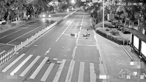 梅县区宪梓中路也发生一起涉及学生骑电动摩托车的交通事故。6月22日22时05分左右,在宪梓中路璇螺湖路段,一名女子正在人行斑马线上过马路,突然一辆电动摩托车快速向其驶来了,摩托车上有两人。随后,摩托车与行人发生了猛烈碰撞,行人倒地后,迟迟无法起身,而摩托车驾乘人员则随摩托车滑行了一段距离后,站了起来(如右图,陈坚平摄)。调查中民警发现,摩托车驾驶人为一名学生,两人驾乘摩托车时同样没有佩戴头盔。