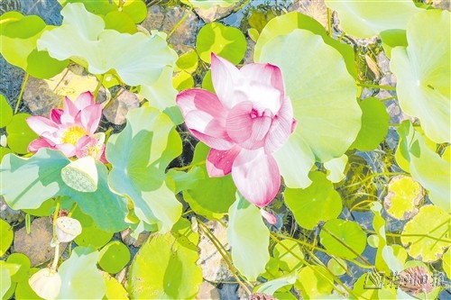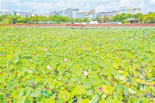 本报讯 (记者吴腾江)“接天莲叶无穷碧,映日荷花别样红。”仲夏时节,在梅城剑英公园内,碧绿的荷叶繁茂如盖,粉嫩的花儿亭亭玉立,或含苞待放“尖尖角”,或竞相盛放“别样红”(如图)。微风拂过,花与叶摇曳起舞,荷叶上露珠随风滚动,荷香沁人心脾。