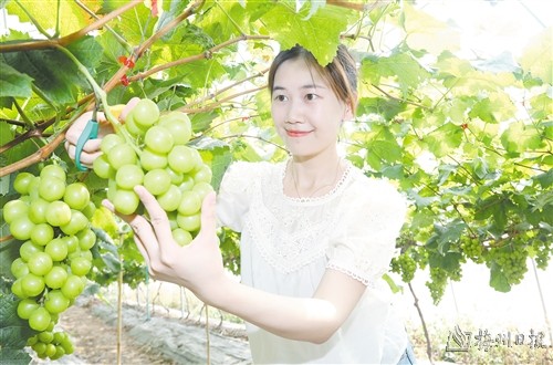 “我是浒竹村人,眼见家乡的土地撂荒、杂草丛生,便与弟弟萌生了集约土地进行生态水果种植的创业念头。”果园负责人李豪告诉记者,经过走访市场后他发现“阳光玫瑰”葡萄口感细腻、果实饱满、甜味十足,是市场上较热门、价格卖得较好的葡萄类型,因此他在果园里遍植该品种。“我们蕉岭是世界长寿乡,气候宜人,土地肥沃富硒,有利于葡萄良好生长,积攒糖分,除了‘阳光玫瑰’外,我们还引进了‘中国红玫瑰’‘妮娜皇后’等优质葡萄品种进行种植。”李豪说。