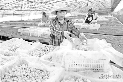 7月13日,河北省沽源县黄盖淖镇一家马铃薯育种中心的工人在分拣收获的脱毒微型薯。