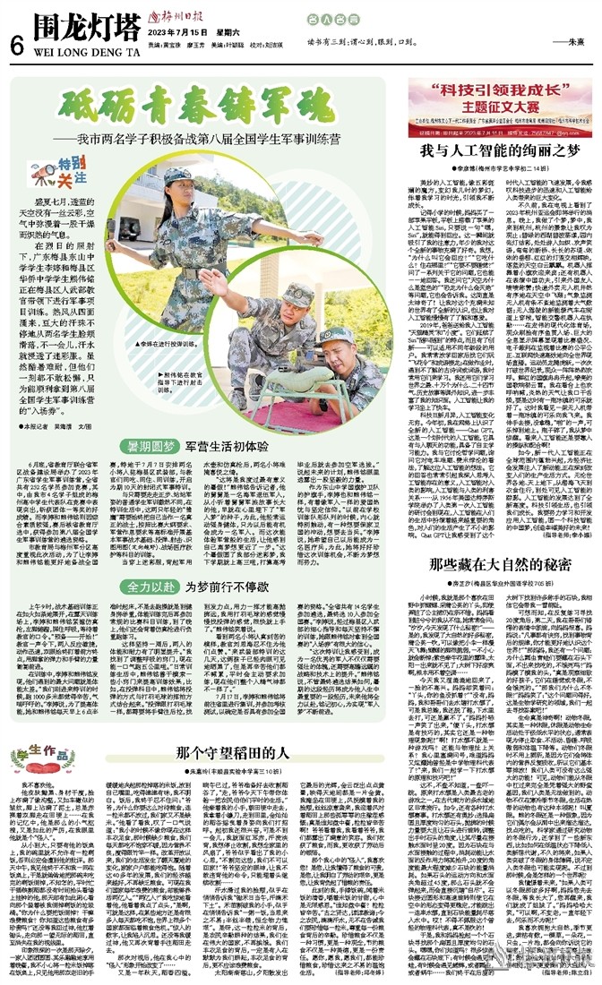 不久前,我在电视上看到了2023年杭州亚运会即将举行的消息。晚上,我做了个梦,梦中,我来到杭州,杭州的景象让我叹为观止:碧绿的西湖碧波荡漾,园内张灯结彩,处处游人如织、欢声笑语,弯弯的断桥、长长的苏堤、依依的垂柳、红红的灯笼交相辉映,湛蓝的天空白云飘飘。机器人挥舞着小旗欢迎来宾;还有机器人在表演中国功夫,引来外国友人啧啧称赞;快递外卖无人机井然有序地在天空中飞翔;气象监测无人机有条不紊地监测着大气数据;无人驾驶的新能源汽车在街道上穿梭,智能交警机器人在执勤……在宏伟的现代化体育场,观众刷脸有序鱼贯入场、巨大的全息显示屏幕显现着比赛盛况、电子裁判在监视着比赛的公平公正、互联网快速高效地向全世界现场直播。运动员龙腾虎跃,一次次打破世界纪录,观众一阵阵热烈欢呼。鲜红的国旗冉冉升起,嘹亮的国歌响彻云霄。我在看台上也欢呼呐喊,炎热的天气让我口干舌燥,要是这时有一瓶冰镇的可乐就好了。这时我看见一架无人机带着一瓶冰镇的可乐向我飞来。我伸手去接,没拿稳,“啪”的一声,可乐掉到地上。瓶子碎了,我从梦中惊醒。看来人工智能还是要靠人的操纵和配合啊!