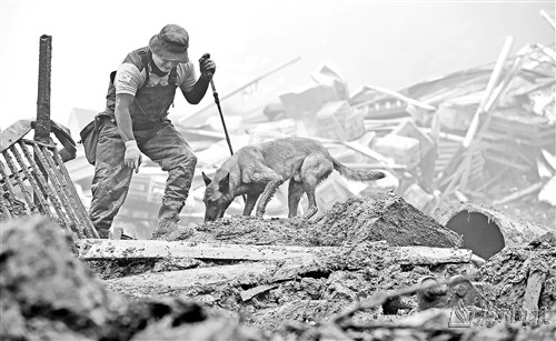 图为7月16日,在韩国庆尚北道醴泉郡,救援人员在因暴雨引发山体滑坡的村庄内搜救。(新华社发)