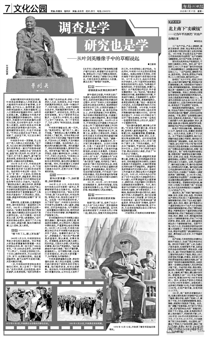 习近平同志强调:调查研究是谋事之基、成事之道,没有调查就没有发言权,没有调查就没有决策权;正确的决策离不开调查研究,正确的贯彻落实同样也离不开调查研究。调查研究是获得真知灼见的源头活水,是做好工作的基本功;要在全党大兴调查研究之风。今年3月,中共中央办公厅印发了《关于在全党大兴调查研究的工作方案》,对开展调查研究从重要意义、调研内容、方法步骤和工作要求作出明确具体的部署指导。今天,我们高举习近平新时代中国特色社会主义思想伟大旗帜,学习贯彻党的二十大精神,推进和拓展中国式现代化,确实离不开深入的调查研究,我们应该遵照中共中央的工作部署,学习和弘扬叶剑英等老一辈无产阶级革命家“调查是学、研究也是学”的精神,坚持不懈地求真务实,才能找准对策,实干兴邦,扎实有效地推进社会主义现代化强国高质量发展。