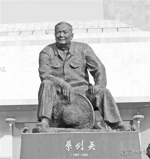 在梅州雁洋的叶剑英纪念馆前,叶剑英坐姿铜像让人印象深刻:高大魁梧的叶剑英右手拿草帽,左手撑膝,坐于石头上,脸带笑意,坚定的眼神远眺前方,形象和蔼慈祥,让人们觉得亲切温暖的同时,油然而生崇敬之意。此雕像由中央美术学院著名雕塑家刘焕章创作。创作过程中,刘教授与叶剑英家属作过探讨与交流,充分听取叶选平、叶选宁等人的意见,选取叶剑英生平中最具代表性的参考图片进行创作。根据李健贤馆长回忆,叶选宁同志曾说:“叶帅从这里走出去干革命,回到家了,应该坐下来,与父老乡亲们好好聊聊天。”