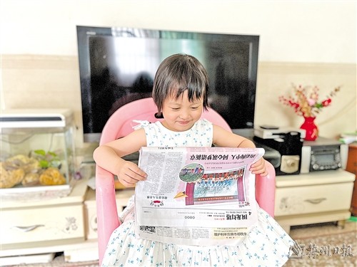 小家伙从小爱读书看报,一直对《梅州日报·围龙灯塔》情有独钟。每期报纸一发下来,小家伙就迫不及待地坐上她专属的凳子,拿起报纸津津有味地看起来。她尤其喜欢里面的画作和学生文章,还说以后也要写文章在《梅州日报》上发表。(冯丹俏)