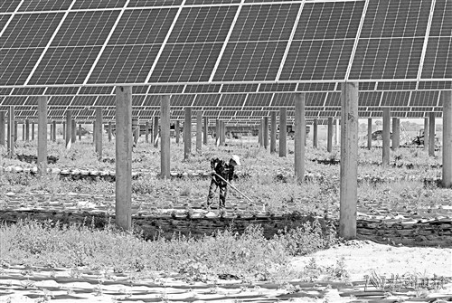 7月17日,农民在围场一处“牧光互补”光伏发电场种植作物。