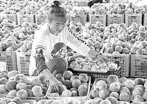 7月19日,河北省乐亭县中堡镇井儿坨村的一名果农在分拣采摘的鲜桃。