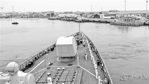 中国海军第43批护航编队18日结束对刚果(布)友好访问,于当地时间上午10时离开黑角港。这标志着中国海军第43批护航编队圆满完成西非5国访问任务。(新华社发)