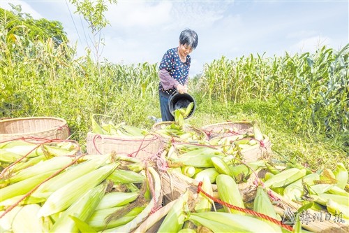 记者日前来到桃西村看到,一片此前杂草丛生的撂荒地,如今已经成为了绿油油的玉米田,一排排金黄且饱满成熟的玉米整齐排列着,村民穿梭在田间熟练地掰下一个个玉米。摘下来的玉米将被运送到村委会进行筛选后再统一销售。“我们共种植了4亩多玉米,预计每亩产量800斤至1000斤,售价为每斤3元。”桃西村党总支部副书记邹绮芬告诉记者,目前桃西村玉米主要通过网上预订的方式进行销售,目前已有不少预订量,销售形势较为乐观。