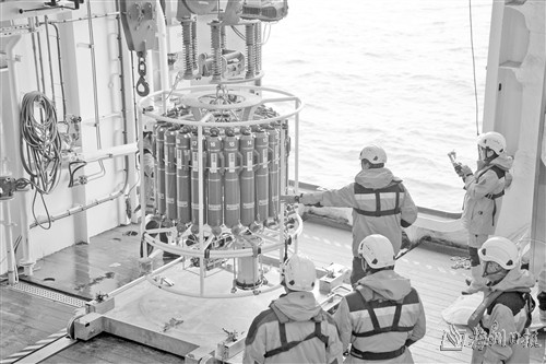 7月22日,中国第13次北冰洋科学考察队进行大洋作业演练,队员准备将CTD(温盐深多参数海洋观测系统)布放入海。