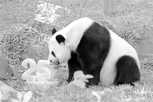 当天上午9时,该动物园工作人员为“美香”送上营养部门精心设计和制作的蛋糕,由冷冻稀释苹果汁制成的数字“25”十分醒目,蛋糕上还有红薯泥、胡萝卜泥、苹果切片和竹子等。
