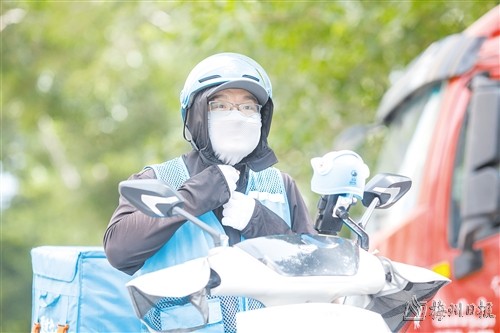 在道路上飞驰,外卖骑手叶斌选择全副武装——防晒衣、防晒面罩、手套、鸭舌帽+头盔,只有这样才能抵挡夏日里过分“热情”的太阳。即便如此,长期户外跑动还是让他晒出了小麦色的肤色。“太阳越大,我们越忙。每天上午10点上班到晚上8点下班,衣服基本都处于湿的状态。”叶斌说,中午就是他们最忙碌的时候,他一中午约能送15单至20单。奔忙时,在有空调的店里候餐就是他们的幸福时刻。“公司为我们准备了清凉解暑的饮品、药品。如果感觉有中暑症状或者其他不舒服的时候,也可以在平台上使用‘小休功能’,找阴凉地或者回站点休息。”叶斌说。