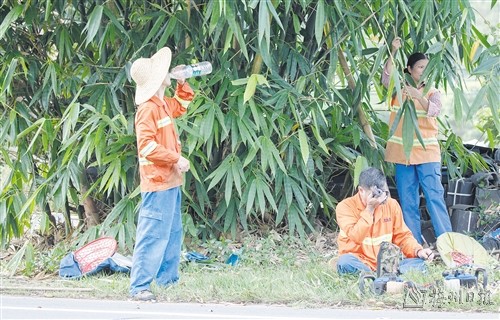 入伏当日,梅江公路事务中心白宫道班工人正在省道333线白宫段修剪路树。在炽热的阳光下树木被晒得无精打采,路上鲜少行人。一上午劳作后,每个人的工服都沾满树屑,汗水湿透衣背,汗珠不断从脸庞滚落。“短袖虽然比较凉爽,但长袖长裤能保护我们避免晒伤也能避免修剪时被划伤。面对高温天气,我们也相应调整了上路工作的时间。”白宫道班班长丘华荣说,虽然大家已经在这条路上工作了十几年,已基本摸透了太阳日照规律,但还是避免不了暴晒的。“在路树遮挡下虽然能避免太阳直晒,但高温路面也非常考验人,地表温度突破50℃,即使站着不动也会大汗淋漓。”说话间,丘华荣拿出随身携带水壶,这是一个容量为3升的巨大水壶,与他同行的同事们携带的水壶均为1.5升以上容量,上午临下班时,他们每个人的水壶都已经空了。“这种天气,我们都习惯了‘大汗过细汗’,一天衣服起码得换两套,汗出得多,喝水也多。像我自己每天都得喝6升以上的水。”丘华荣说。