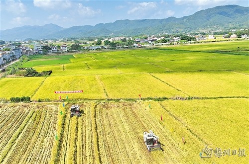本报讯 (记者丘琼 特约记者蕉新宣)金色田野千重浪,农机隆隆夏收忙。日前,在三圳镇芳心村,金灿灿的稻浪随风起伏,稻香迎面而来,收割机穿梭稻浪之中,伴随着“隆隆隆”的轰鸣声,收割、脱粒等工序一气呵成,金黄的田野间一派繁忙丰收景象。5台收割机将一簇簇稻谷尽收其中后,直接输送到路旁的运输车中,确保颗粒归仓。
