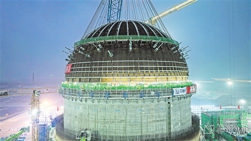 当日,徐大堡核电项目3号机组顺利实现穹顶吊装就位。徐大堡核电项目3、4号机组建成后,预计每年可提供160亿千瓦时以上清洁电力,相当于年节约燃煤570万吨,年减少二氧化碳排放量1680万吨,对于保障我国能源安全、优化能源结构具有积极作用。(新华社发)