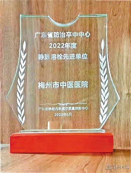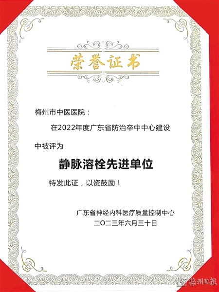 本报讯 (记者江波 通讯员宋育妮)近日,梅州市中医医院获得由广东省医学会颁发的2022年度广东省静脉溶栓先进单位称号,是梅州市唯一一家获此殊荣的国家级综合防治卒中中心。