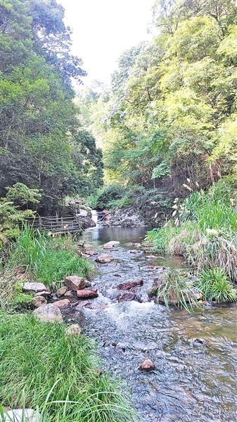 第一站是下梁野。首先映入眼帘的是波光粼粼的仙姑湖,沉静安然地躺在青山的环抱,微风轻拂,淡淡白云浮在浩渺苍穹,倒映清澄亮泽的湖中,宛如绝胜蓬莱佳境,让人怦然心动。沿着湖畔逐级而下,同伴的私语都被潺潺的水声掩盖。披云瀑宛如银河倒挂,一匹白练顺崖冲下,闪着亮光奔流跳跃,蔚然大观;通天瀑气势磅礴,像一条巨龙飞腾咆哮,以排山倒海之势呼啸泼洒,溅起的白波若卷雪,人行明境中。看不见身影的蝉不急不缓地鸣唱,声音高昂回荡山谷,益发显得幽静与深邃;蓝尾喜鹊拖着长长的漂亮尾巴在密林中飞来飞去,穿着绿点花外套的角蛙呆萌地聆听着松风竹韵,偶有水蛇机灵地在石头与水草间出没……优秀的生态资源,让梁野山的原始丛林充满着粗犷剽悍而又神奇莫测的野性之美。
