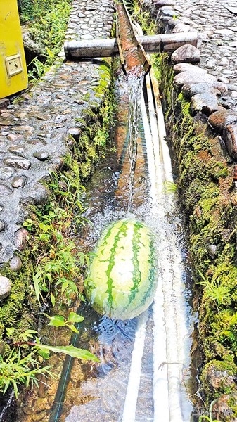 顺着溪涧返回,道路旁的溪流晶莹清澈,每隔几米漂浮着几个西瓜,西瓜墨绿的条纹像挥舞的绸带,在低吟浅唱的水声伴奏中,随着活泼的溪水起伏旋转跳起了圆舞曲。意想不到的是岸边有秤、有水果刀、有二维码、有每斤的标价,如果渴了饿了馋了,尽可自行挑选、自行扫码付款、自行剖开品尝,经营模式创新、和谐、开放,彰显着新农村的新气象。