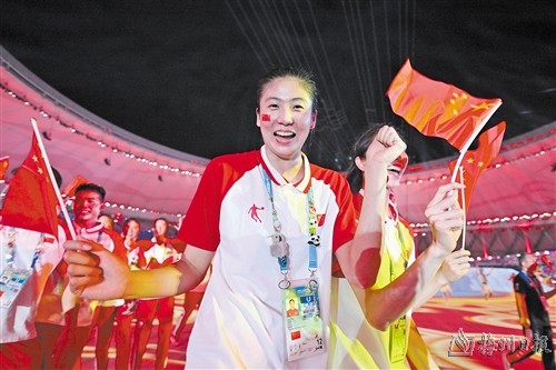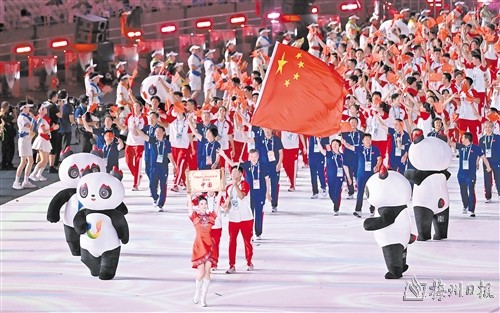 伴随着熟悉的《好一朵美丽的茉莉花》旋律,清华大学排球运动员胡朕卓和西南大学网球运动员郭涵煜共擎五星红旗,引领着中国代表团入场。400余名中国大学生运动员将参加全部18个大项的比赛。他们来自25个省区市百余所高校,平均年龄22.9岁。