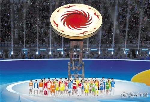 在主题曲《成就梦想》歌声中,道道金色光芒洒向地面,代表参赛国家和地区的旗帜汇聚于场地中央,寓意地球村的居民们沐浴在同一片阳光之下,以包容的胸怀构建和而不同的精神家园。
