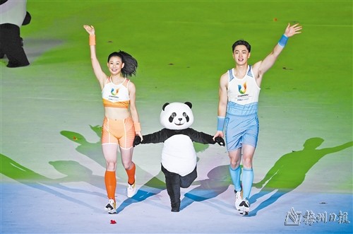 合着由大学生乐队现场演奏的音乐节奏,大学生运动员们入场了,全世界青年健儿在蜀绣铺就的锦绣之路上,去追寻他们的锦绣前程。成都的夜空下,年轻人彼此问候、热情相拥、与憨态可掬的“蓉宝”合影留念,欢声笑语随夜风飞扬……