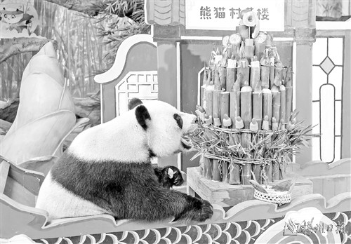 7月29日,广州长隆大熊猫三胞胎二弟“帅帅”在享用特制的生日蛋糕。