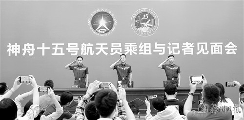 图为航天员费俊龙(中)、邓清明(右)、张陆敬礼致意。