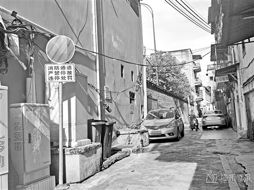 接到反映后,记者来到现场,在凌风西路与民主路交叉口东侧的考院前楼附近巷道看到,路面两侧均划有黄色单实线,路口竖立着写有“消防通道严禁停放”字样的交通警示牌,但有几辆小汽车仍被停放在本就不宽的巷道中,路面剩余宽度仅够摩托车通行。“附近都是老房子,如果发生火灾或其它意外,消防通道被堵塞就很危险了,平时我们出入也不方便。”周边一位住户表示。