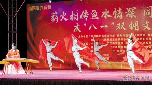 8月1日晚,2023年庆“八一”双拥文艺展演活动(如右图,连志城摄)在梅城八一训练场举行,市委常委、副市长陈金銮,市委常委、梅州军分区政委陈煜昌到场观看。此次活动由市委宣传部、市退役军人事务局、梅州军分区政工处、梅江区双拥工作领导小组、广东梅州职业技术学院联合主办,以“薪火相传鱼水情深 同心共筑和谐梅江”为主题,邀请军人、民兵、立功受奖军人家属代表到场观看。独唱《战士与母亲》、器乐表演《军歌联奏》……一个个军味十足的表演先后登场,赢得阵阵掌声。