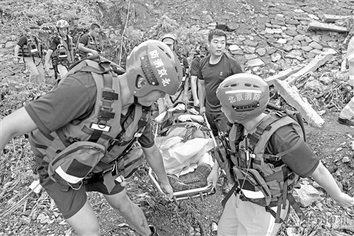 图为8月1日,在北京市门头沟区水峪嘴村,在此增援的北京大兴区消防救援支队的消防员在转运一名受伤村民。