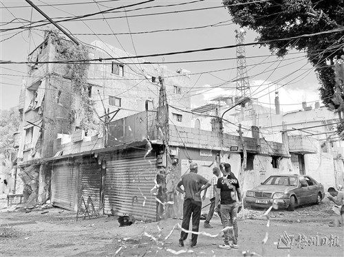 8月1日,在黎巴嫩南部西顿市附近的艾因·哈勒瓦难民营,几名巴勒斯坦男子查看财产受损情况。
