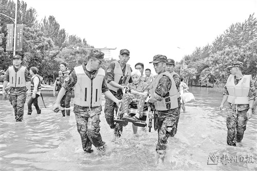 北京卫戍区第一时间启动应急预案,1.8万余名首都民兵奔赴救灾一线;天津警备区发出倡议书,出动民兵3000多人次,沿永定河、北运河等泛洪区开展筑堤固坝、转移群众、运送物资等工作;河北省军区设立前方指挥部,组织4000余名民兵,赶赴6地支援抢险救灾,救助转移群众。