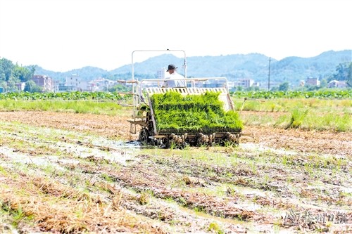 记者日前走进位于兴宁市大坪镇潭坑村的兴宁市润丰农业专业合作社种植基地时,30多名农人正在试验田里抛秧,不远处的常规稻田里,插秧机“哒哒”作响,所过之处,田间又披上“绿衣”(如右图,高讯摄)。“在农业农村部门指导下,我们在台风‘杜苏芮’登陆前进行了抢收,顺利完成了1200亩早稻的收割工作。目前晚稻种植也进入收尾阶段,夏种进度达到了90%以上。”该合作社相关负责人罗新平告诉记者。据介绍,我市今年上半年风调雨顺,利于农业生产,该合作社早稻收成比去年略高,其中杂交稻亩产湿谷达1400斤。
